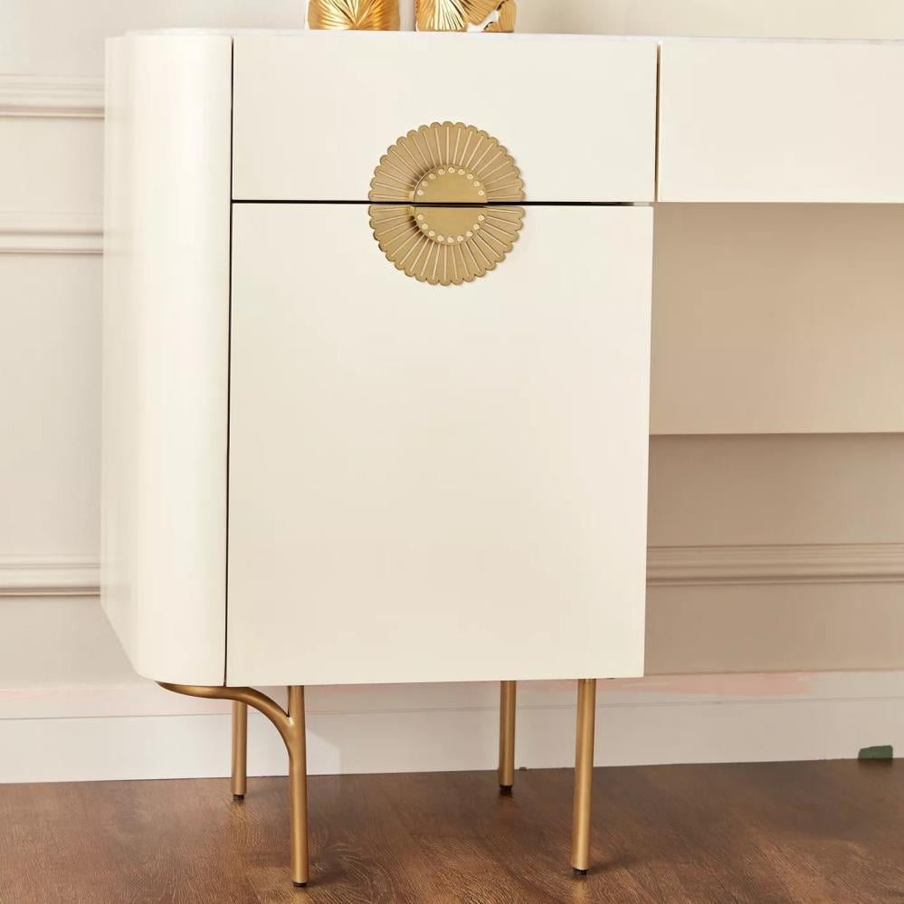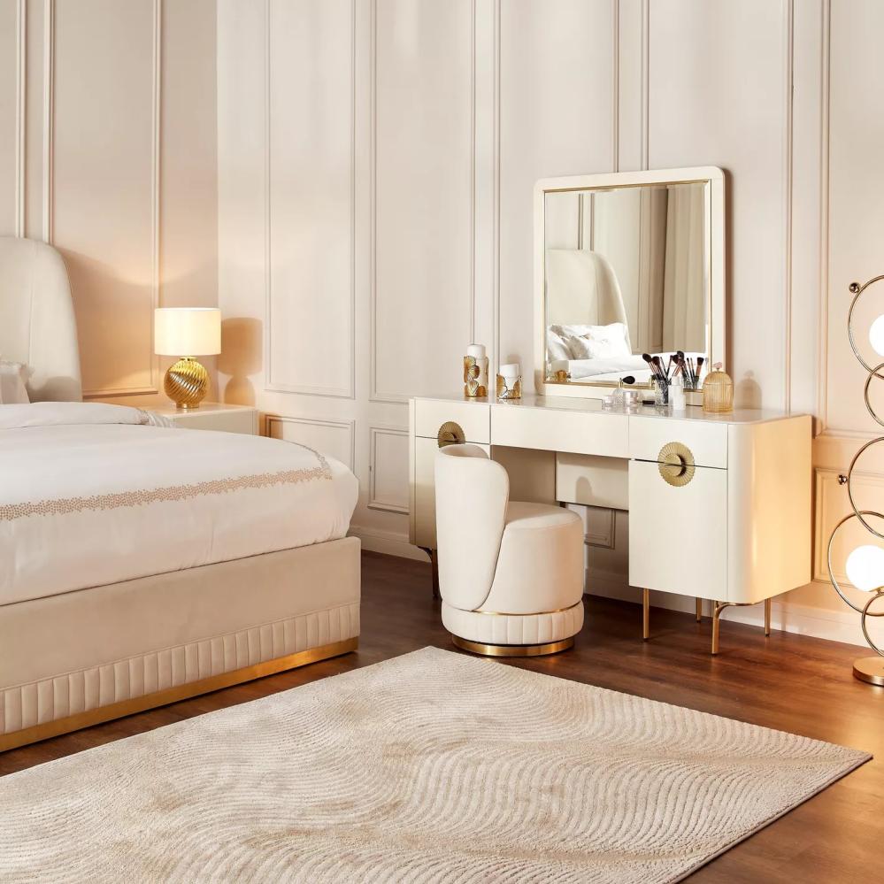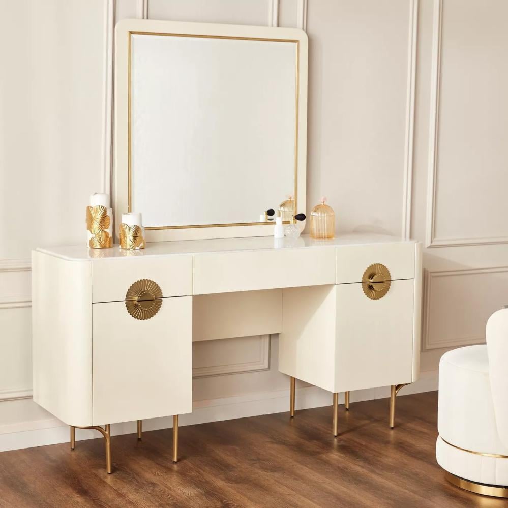 اختيار عصري لا غنى عن إضافته لأي غرفة نوم عصرية. مصنوعة من الرخام والذهب بسطح مطلي استثنائي يزيد جاذبيّتها. مزيّنة بمقابض متينة ومزوّدة بمرآة تكمل احتياجاتك الأساسيّة في غرفة النوم.