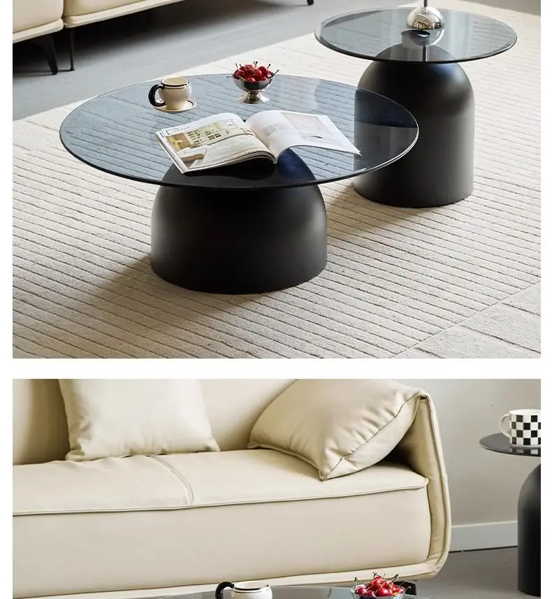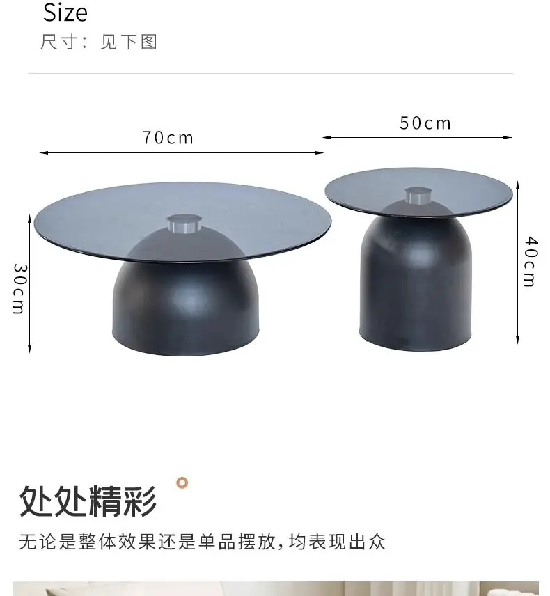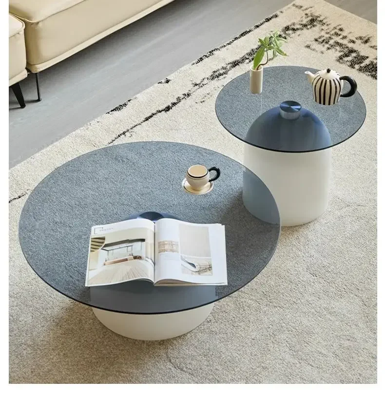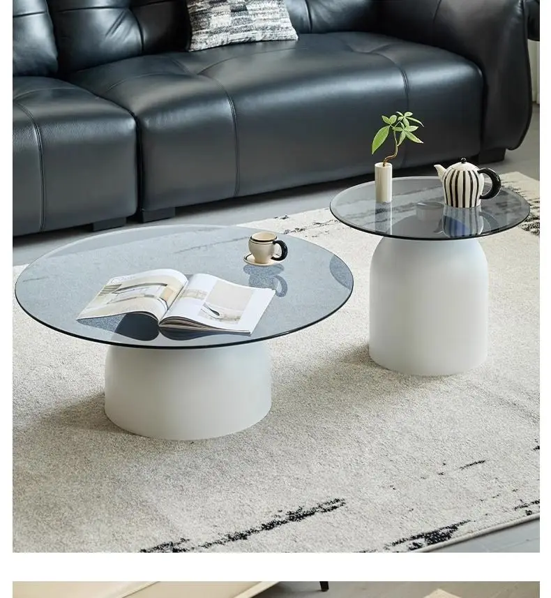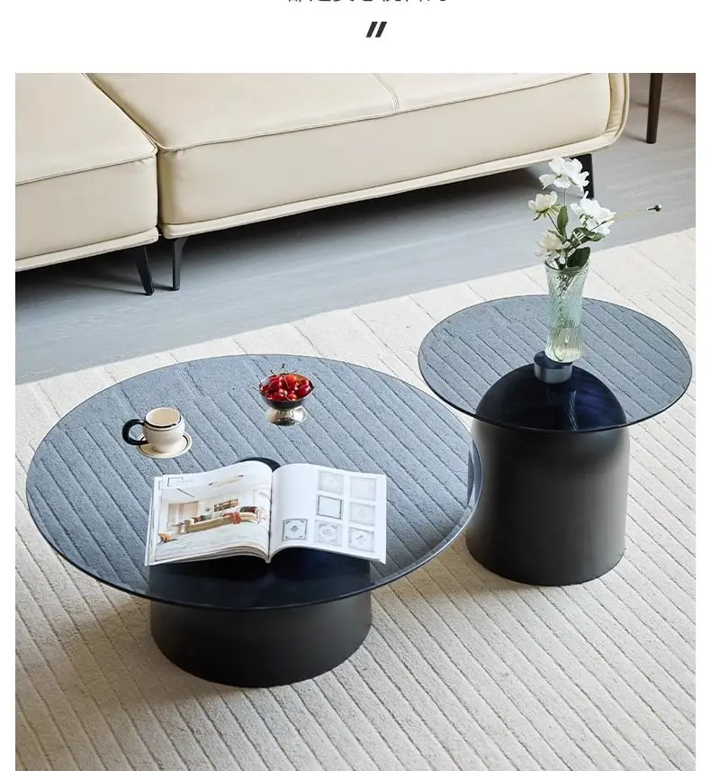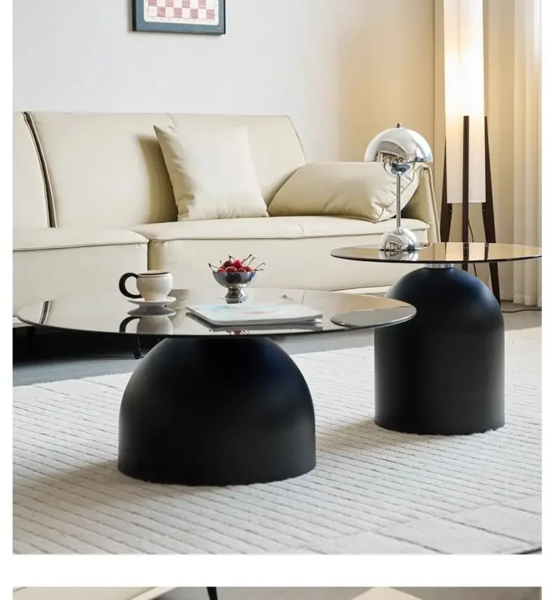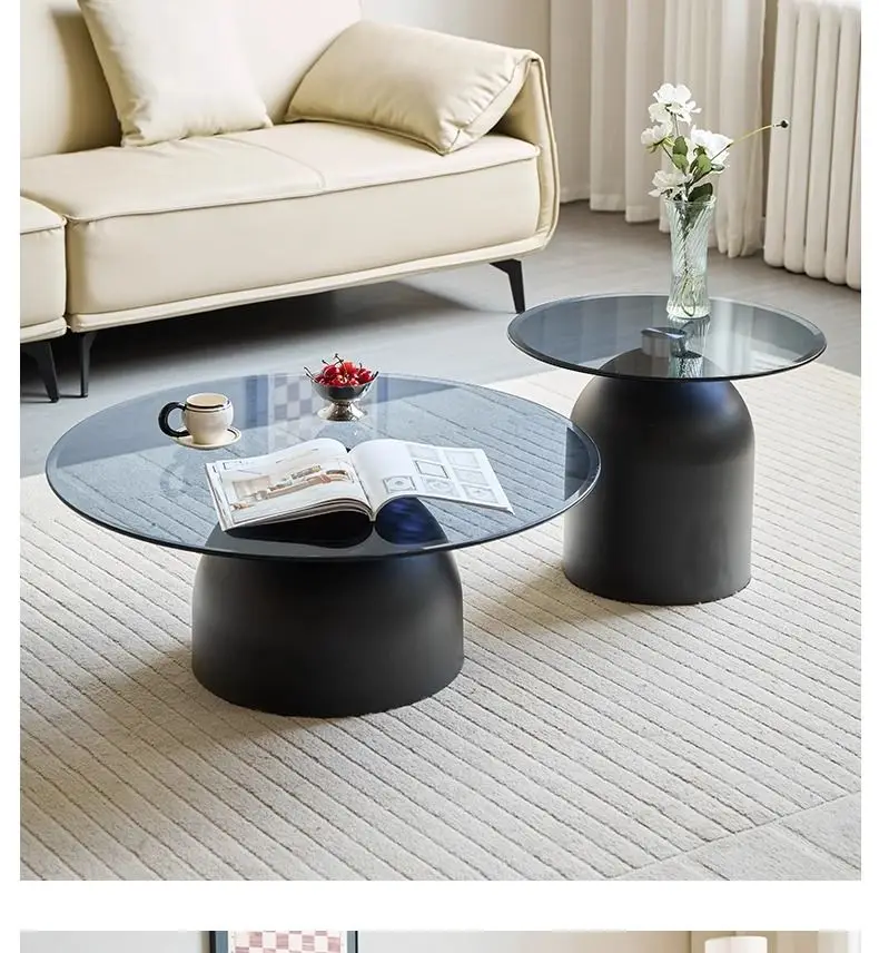 طاولة قهوة زجاجية مستديرة حديثة، قاعدة معدنية وسطح من الزجاج المقسى، طاولات جانبية متداخلة لغرفة المعيشة، طاولة أريكة،