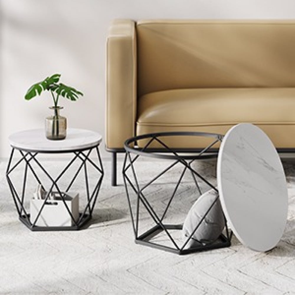 طاولتين جانبية بسطح رخامي وإطار أسود من الستيل: الفخامة والوظائف المتعددة في تصميم واحد