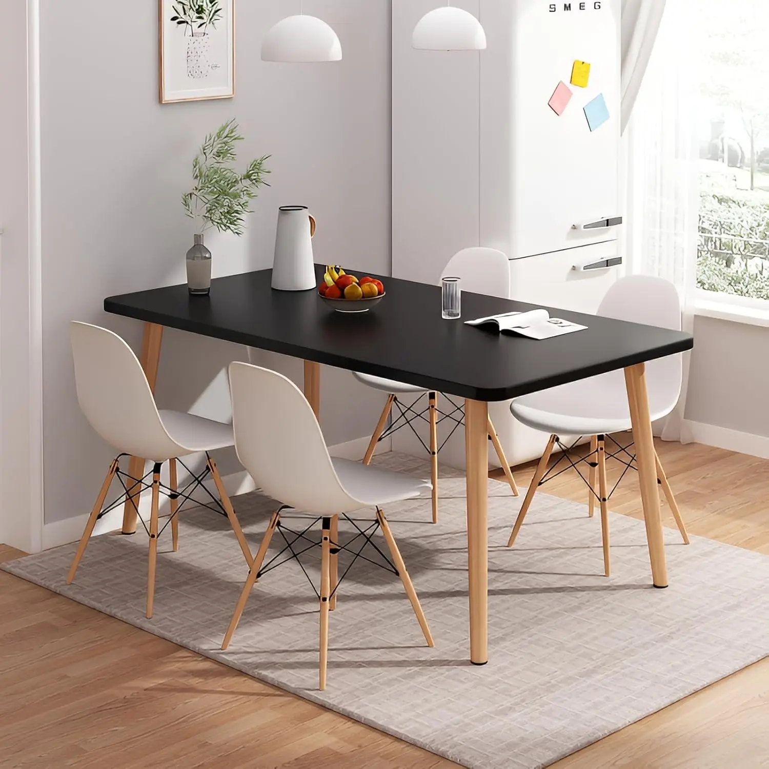 طقم طاولة طعام من الخشب الصلب - طاولة خشبية سوداء أنيقة مع 4 كراسي بيضاء أنيقة، تصميم أنيق ومعاصر لتناول الطعام