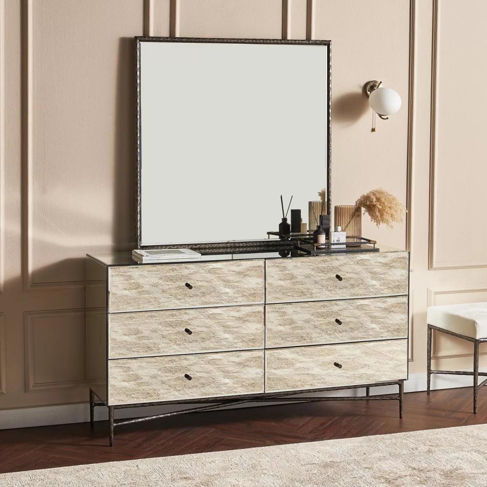 أضيفي التسريحة الرائعة هذه إلى أساسيات غرفة نومك، مصممة بـ 6 أدراج لتتيح لك تخزين مختلف اكسسواراتك وأغراضك بطريقة منظمة، وبقوائم حديد مطلية وإطار متين بتشطيب مطروق، ومصنوعة من خامات عالية الجودة.